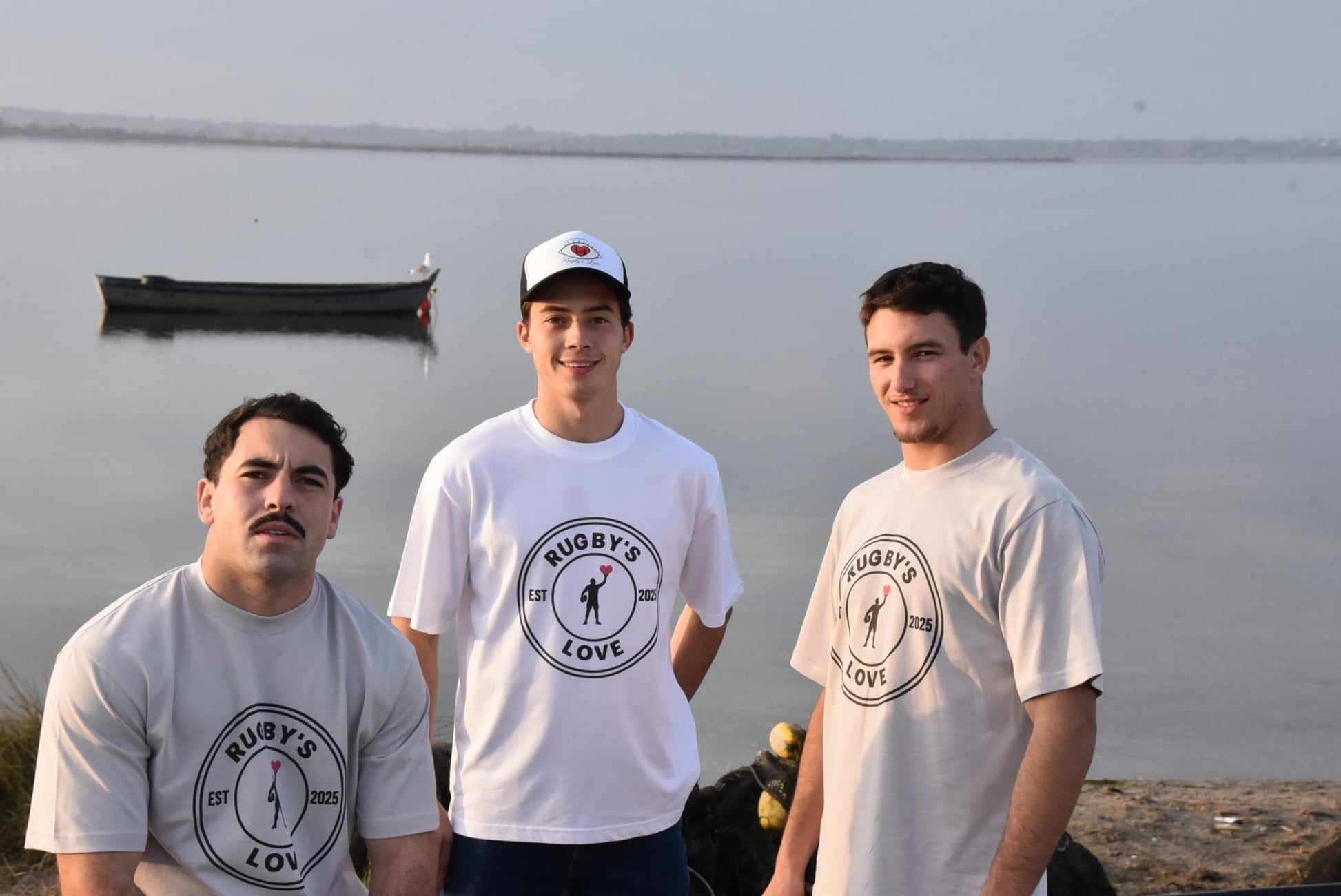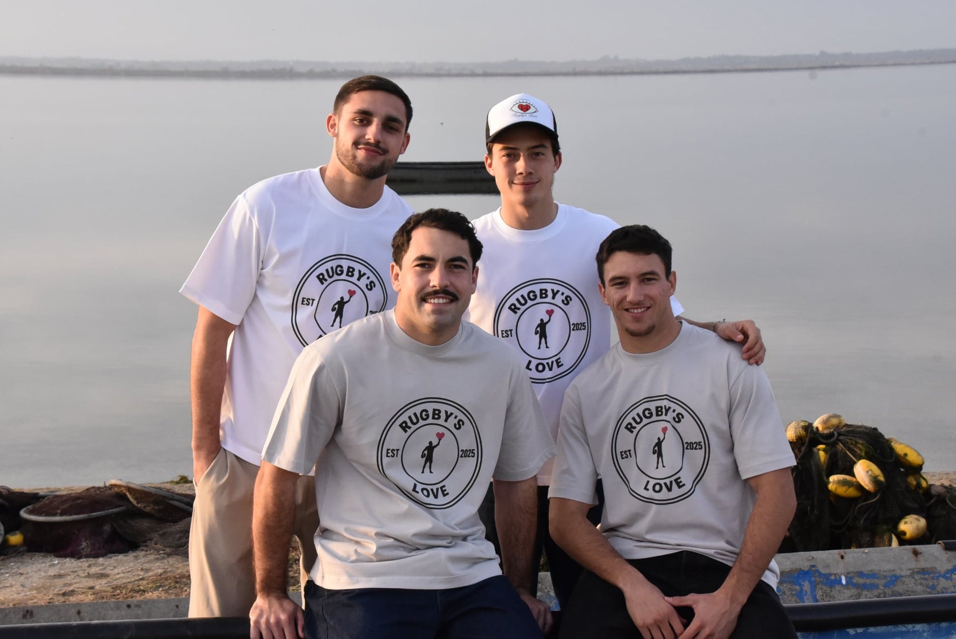 Design Minimaliste : Logo circulaire "Rugby's Love - EST 2025" avec silhouette de joueur.